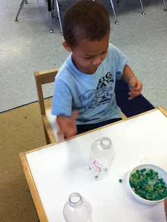 We also practiced counting, sorting, and one to one correspondence as we recognized the number on the bottle, chose a color, and counted out that many beads into the bottle. The children worked in pairs to check each other's counting. Allowing the children the opportunity to work in pairs provides an opportunity to practice cooperation and collaboration-social skills that will benefit the children throughout their lives!