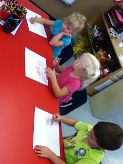 We practiced writing our names today! There are different stages to learning how to write your name. If your child writes his/her name, but it looks like scribbles or markings on a page to you, don't worry! This is an important part of the writing process! With time, practice, and encouragement you will see your child's writing become more defined.